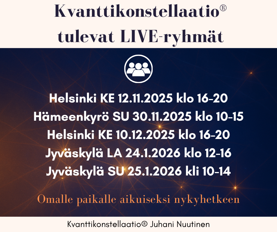 Teen kvanttikonstellaatioryhmiä verkon yli Zoom-sovelluksella sekä lähitapaamisia "Livejä" Helsingissä ja satunnaisesti myös muilla paikkakunnilla. Tiedotan ajoista ja tapahtumista tällä sivulla, Facebookissa (Kvanttikonstellaatio Juhani Nuutinen) sekä whatsapp-ryhmässäni.