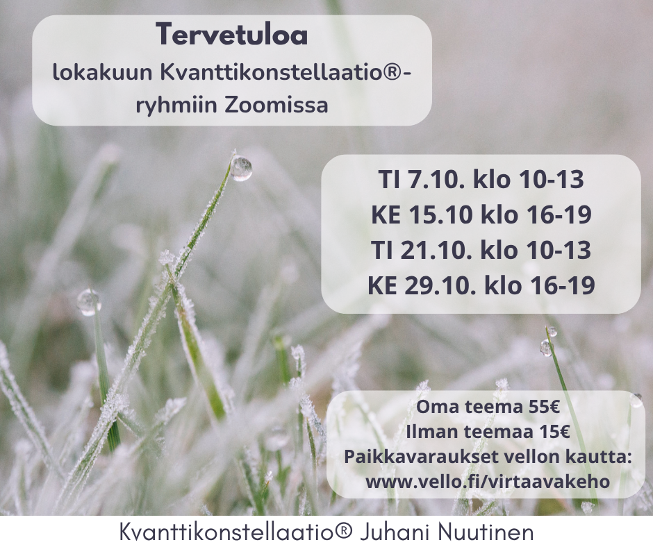 Kvanttikonstellaation Zoom-kerroilla on aina ollut hyvin rauhallinen tunnelma ja ilmapiiri on ollut turvallinen. Luot sitä ohjaajana varmalla olemuksellasi. Kaikenkaikkiaan on aina voinut hyvin ja turvallisin mielin osallistua. Koen, että omien teemojen osalta prosessit ovat lähteneet liikkeelle ja tästä on hyvä jatkaa matkaa edelleen 😊